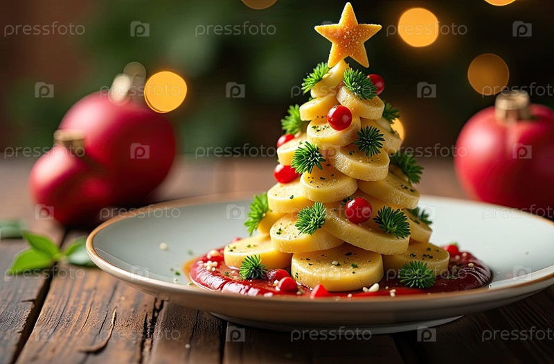 Вкусные выпечки печенье в виде рождественской елки из ягод, листьев мяты на праздничном новогодном столе. Рецепт и красивая презентация. Рождественский декор и установка стола. ИИ генерируется