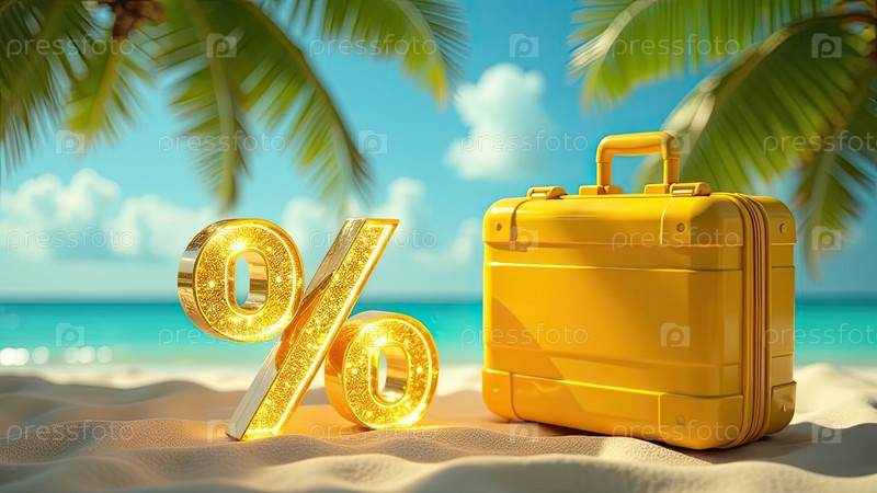 Золотой светящийся знак процент И желтый чемодан на берегу моря с тропическими пальмами под ярким солнцем, океанический закат в фоне. Горячие летние распродажи и скидки, горячий туристический баннер, листовка. AI генерируется
