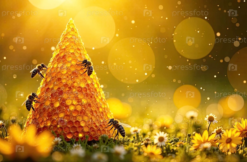 Мед в сосудах в форме конуса рождественской елки с пчелами на летнем поле под солнечным светом.Пчеловодство, Рождество, Новый год.Искусственный интеллект создан