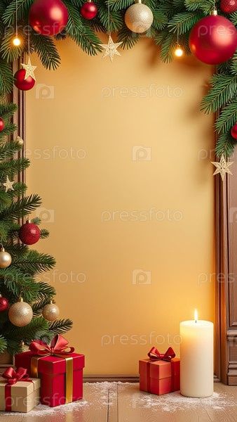 Рождественские поздравительные открытки приглашение с пространством для текста в раме на золотом фоне со светящейся рождественской елкой и гирляндой, шарами, подарочными коробками