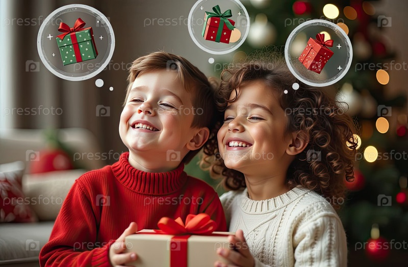 Круглые волосы мальчика и девочки в свитерах мечтают о подарках на Новый год - большие мультфильмы, нарисованные кругами со символами подарков внутри