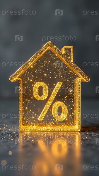 Золотой светящийся символ процент в доме на сером бетонном фоне с золотым блеском. строительство жилья, скидка, купон, покупка, продажа, риэлторская деятельность, ипотека, страхование, бронирование. AI generated