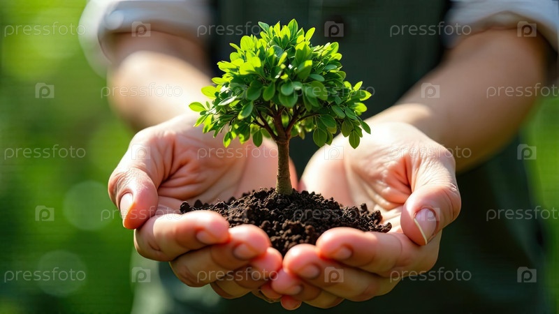 Крошечное зеленое дерево в горстке земли в руке в земле на близком расстоянии.Экология, уход, бонсай.Искусственный интеллект создан