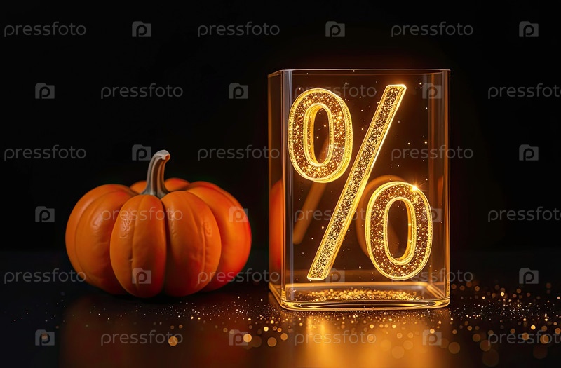 Золотой светящийся процентный знак с тыквой на черном фоне со свободным местом для текста. Осенние распродажи и скидки, баннер Harvest и Halloween, флаер с пространством для копирования. ИИ генерируется