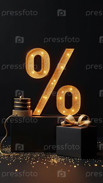 Неон светящийся золотой процентный знак на черном фоне. витрина магазина для Черной пятницы, распродажи, скидки, сумки для покупок. баннер, флаер. AI generated