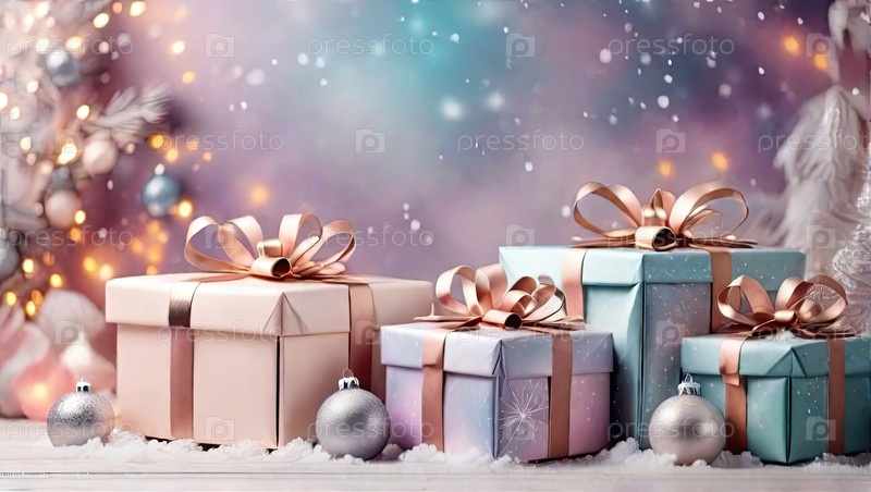 Рождественский фон с подарочными коробками с лучами в нежных розовых, бежевых, синих тонах, боке и фейри-свете. Праздничное настроение Рождество и Новый год. ИИ генерируется