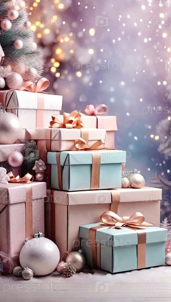 Рождественский фон с подарочными коробками с лучами в нежных розовых, бежевых, синих тонах, боке и фейри-свете. Праздничное настроение Рождество и Новый год. ИИ генерируется