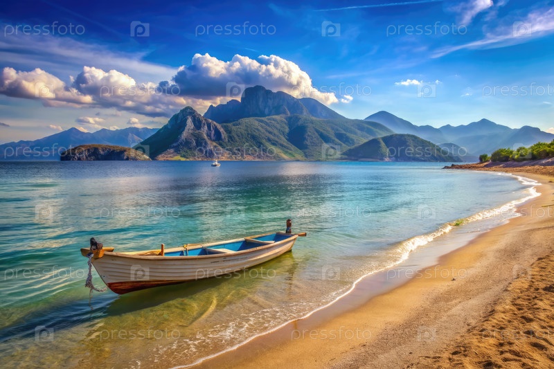 Спокойная маленькая лодка якорь на песчаном пляже с величественными горами на заднем плане в солнечный день