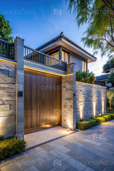 Дом с большой дорожкой и каменной стеной. генеративный современный ИИ