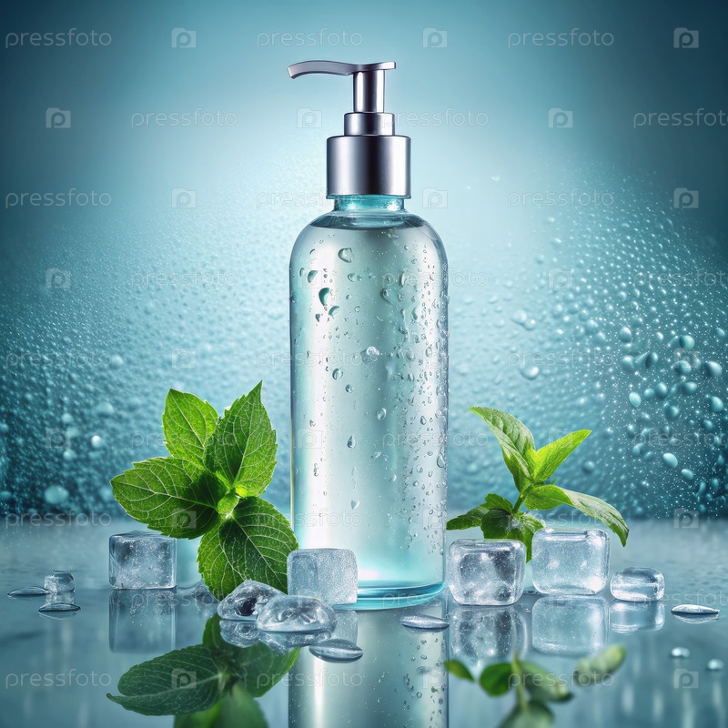 Диспансер мыла, окруженный кубиками льда и мятой. генеративная ИИ