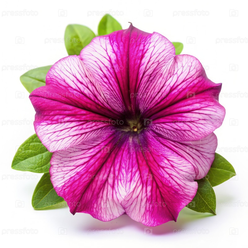 Одинокий розовый цветок петунии с зелеными листьями на белом фоне