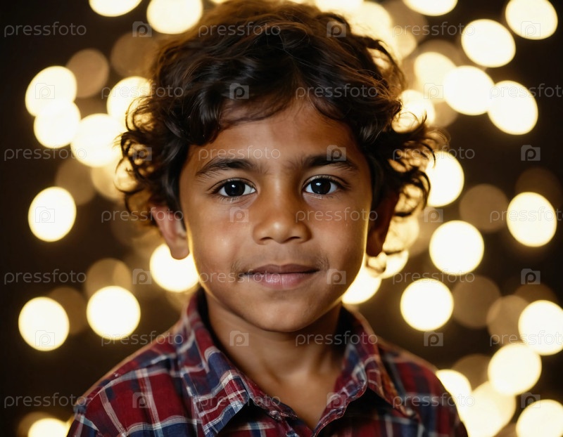 Молодой австралийский абориген смотрит уверенно, с нежной улыбкой на лице, освещенный мягкими светящимися огнями, захватывая суть традиции и гордости