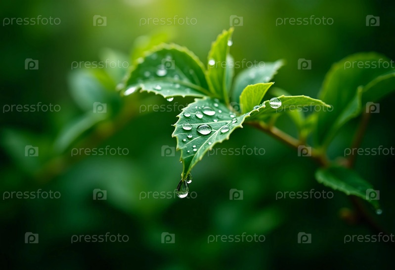 Капли дождя нежно цепляются за изумрудно-зеленые листья, отражая мягкий утренний свет в спокойной атмосфере сада, отмечая красоту свежести природы Generative AI