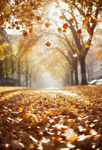 Солнечный свет фильтруется через ветви, когда листья медленно падают на землю, покрывая улицу золотыми и янтарными оттенками, создавая спокойную осеннюю атмосферу