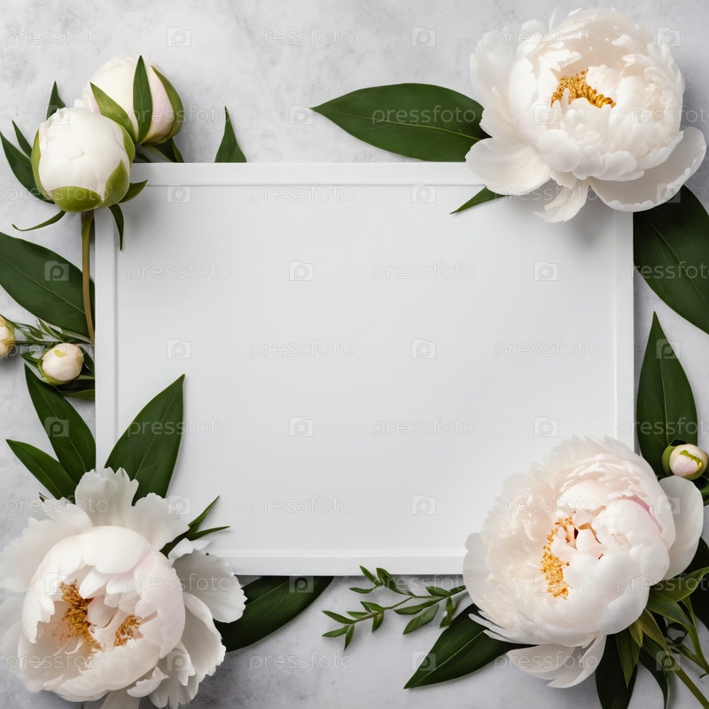 Коллекция пышных белых пион и зеленых листьев окружает пустое полотно, предлагая изысканный фон для художественных рисунков или сердечных сообщений в спокойной атмосфере