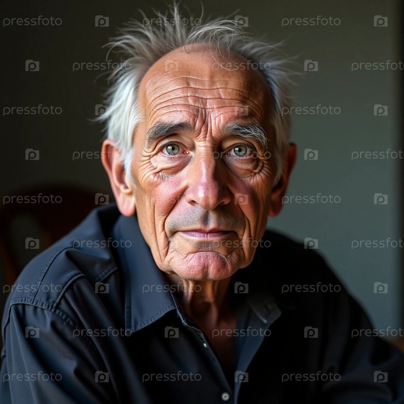 Пожилой мужчина с поразительными чертами лица мысленно сидит в слабо освещенной комнате. его интенсивный взгляд отражает всю жизнь переживаний и сложностей, освещённых мягким теплым светом Generative AI