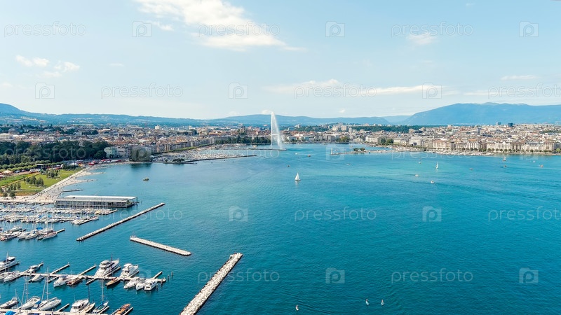 Женева, Швейцария. Фонтан Дже-Дэу. Большой реактивный фонтан длиной до 140 метров. Главная достопримечательность Женевского озера. Летний день, Aerial View