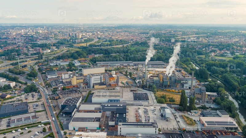 Фабрика с дымоходами и облаками дыма в пригороде Гента Река Эско (Шелда), Aerial View Gh