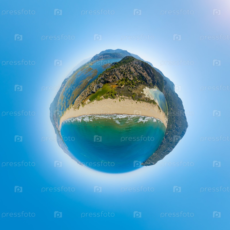 Дальян, Турция.Креативный вид астероида с сферической панорамой над пляжем Изтузу, изогнутой береговой линией и лесистыми горами. 360-градусная аэропанорамная планета