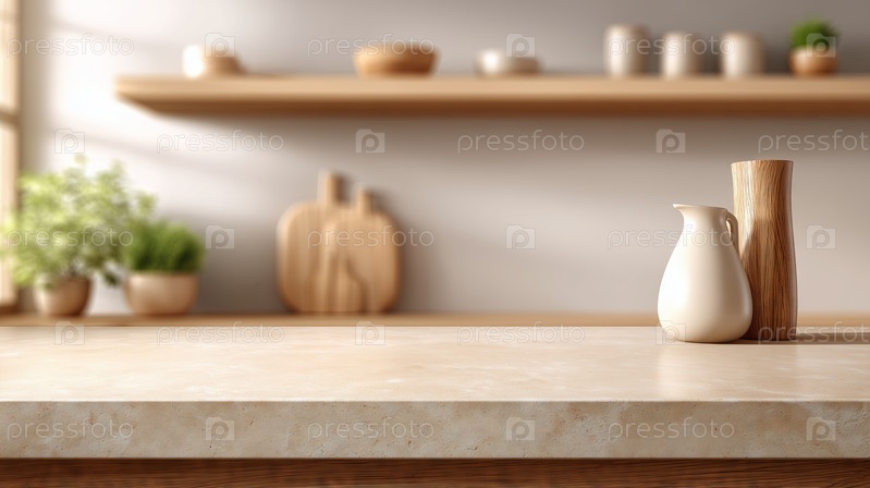 Керамический горшок и деревянная ваза на бежевом кухонном столе из камня
