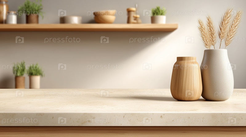 Минимальная кухонная столешница с керамическими и деревянными вазами
