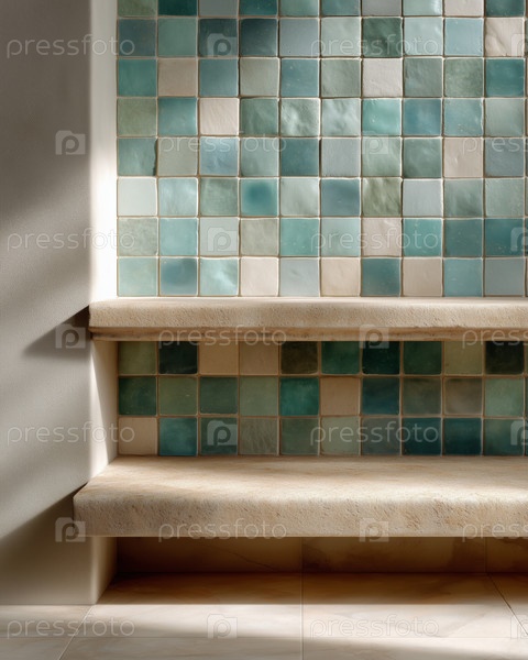 Двойная каменная скамейка с бирюзовыми мозаичными плитками на стене в интерьере спа