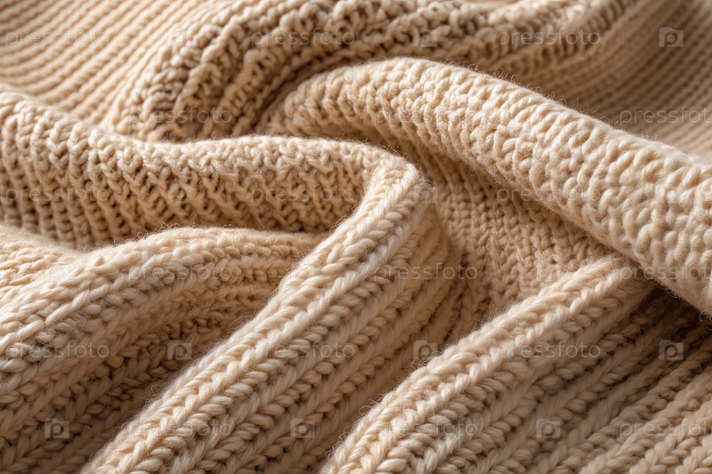 Близкий план складной бежевой вязаной шерстяной ткани с ребристой текстурой