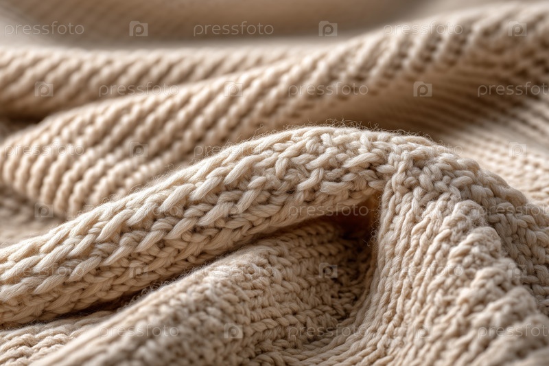 Бежевая вязаная шерстяная ткань крупный план с видимой текстурой и складками