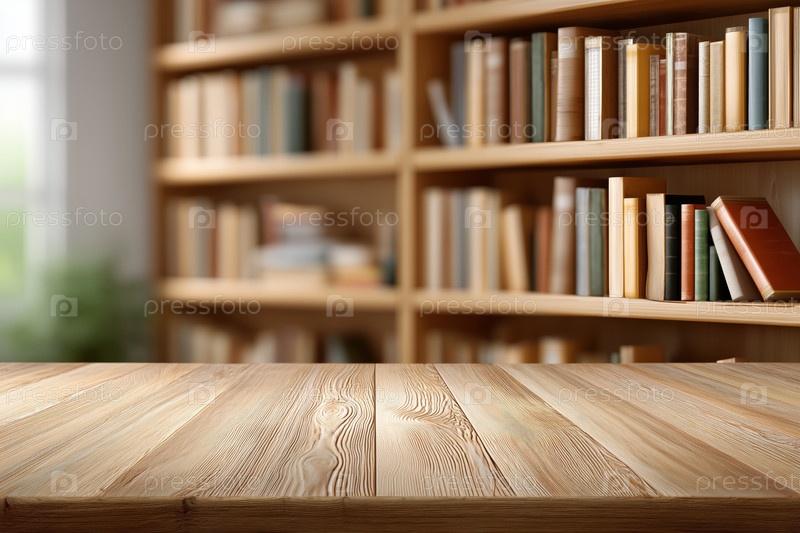 Деревянный стол с размытым фоном библиотеки