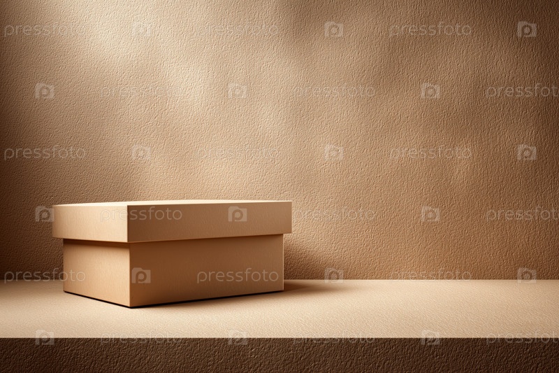 Картонная коробка с крышкой на бежевой текстурированной платформе в минимальной студии