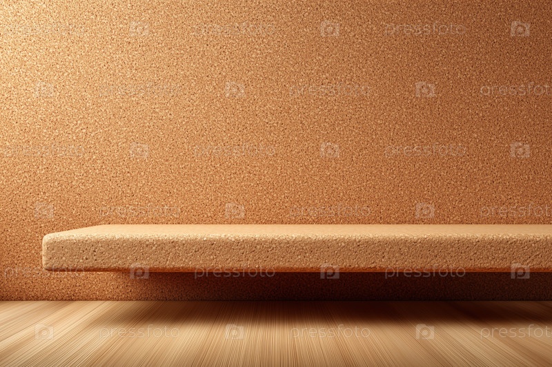 Корковая полка на корковой стене с деревянным полом в минималистическом интерьере