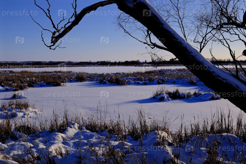 Замерзшее озеро, камыш и звериные следы на свеже выпавшем снегу. Солнечный морозный день. Январь 17 2026 г