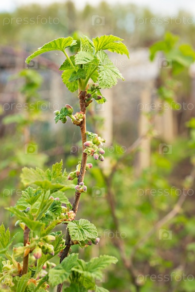 Цветки черной смородины на ветке кустарника на фоне зеленых листьев смородины.Весенний цветущий сад