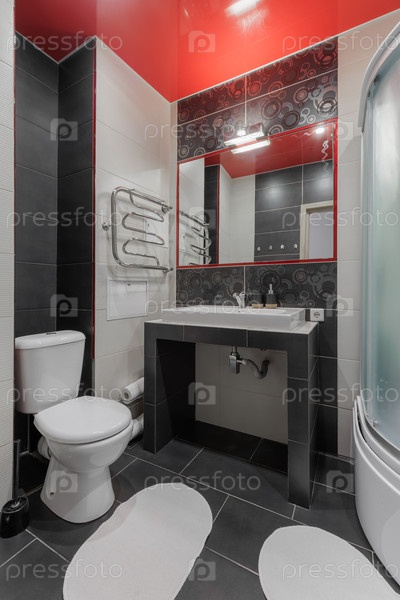 Современный дизайн ванной комнаты с белым туалетом, квадратным раковиной на консоли из черных плиток и большим зеркалом. Стильный интерьер с ярко-красным глянцевым потолком, хромированным обогревателем полотенца и декоративными акцентами мозаики. Чистая м