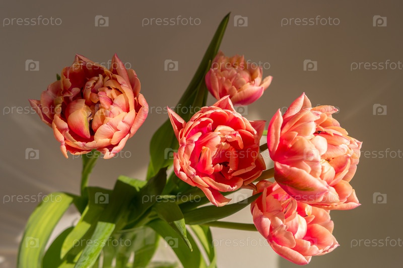 Двойной или пионный тюльпан в прозрачной стеклянной вазе на светлой стене. пышные розовые и желтые почки ловят лучи заходящего солнца
