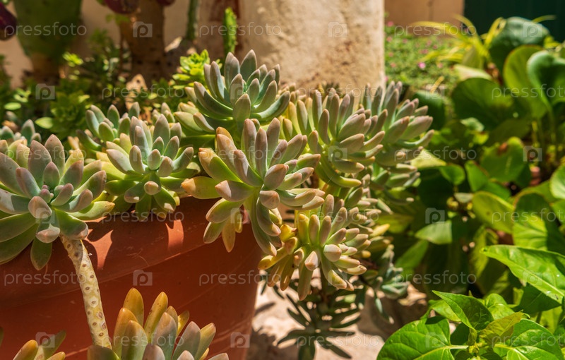 Graptosedum Francesco Baldi в большом глиняном горшке и другие зеленые растения на фоне старого дома Уютная итальянская улица Матера Регион Базиликата, Южная Италия