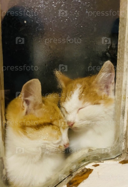 Два котенка за окном дома согреваются друг о друга в холодный дождливый декабрьский вечер