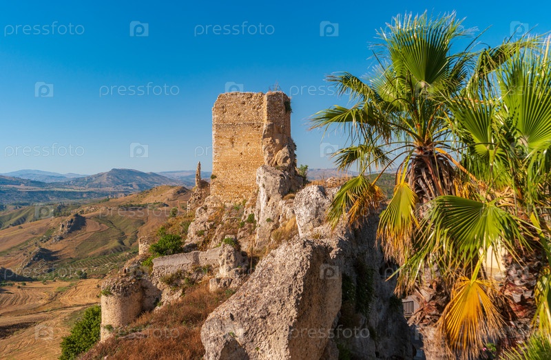 Замок Баррези в Пиетраперсии, Италия. вид на стену бастиона с башней и пальмовыми листьями на переднем плане