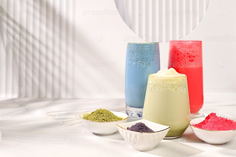 Ассортимент красочного японского чайного латте с молоком, зеленым, синим, розовым лунным молоком на солнечном кухонном фоне