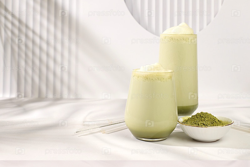 Зеленый чай мача латте с молоком на элегантной кухне солнечный фон с пальмовыми листьями и порошком матчи. традиционный индийский напиток, богатый антиоксидантами используется для похудения и лечения,