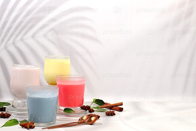 Ассортимент различных мача-чай латте с молоком на элегантном солнечном фоне кухни и порошок матчи.Традиционный индийский напиток, богатый антиоксидантами, используемый для похудения и лечения