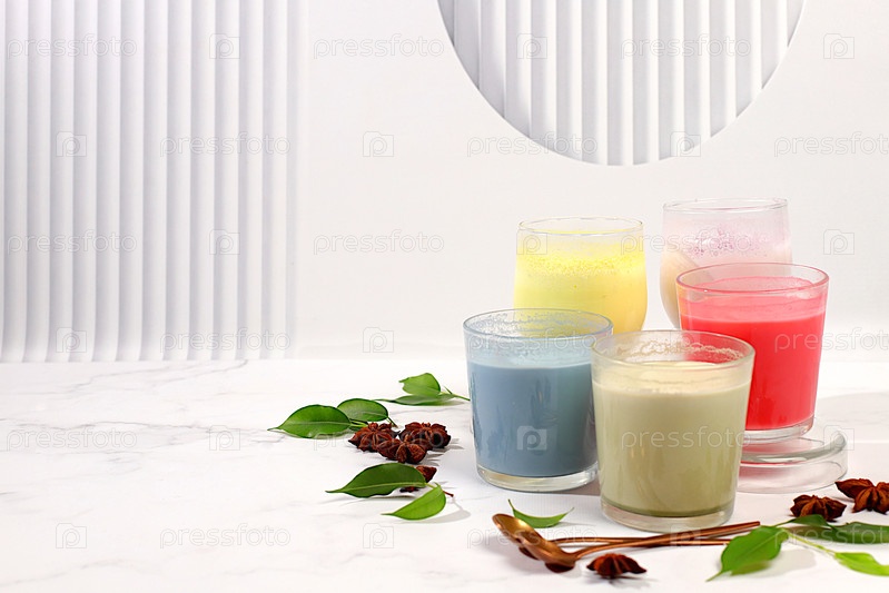 Ассортимент различных мача-чай латте с молоком на элегантном солнечном фоне кухни и порошок матчи.Традиционный индийский напиток, богатый антиоксидантами, используемый для похудения и лечения