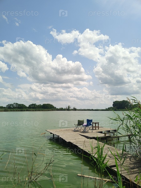 Деревянный пирс со стульями на озере под голубым небом, расслабляющий летний фон, мирные обои с водой
