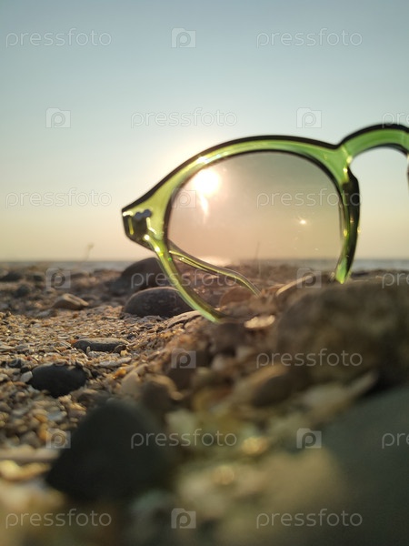 Художественный вид пляжа на закате через зеленые солнцезащитные очки с теплым солнечным светом, отражающимся на песке и гальки.Эта творческая перспектива сочетает в себе летние вибрации, праздничное настроение и мечтательную атмосферу, идеально подходящую