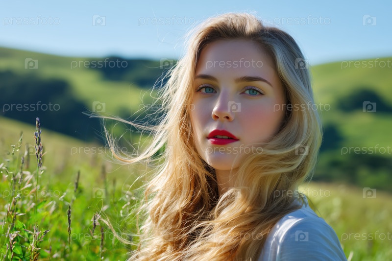 Портрет красивой молодой женщины с длинными светлыми волосами на зеленом лугу