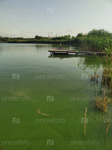 Деревянный пирс на спокойном зеленом озере с тростниками, тихий фон природы, обои мирной воды
