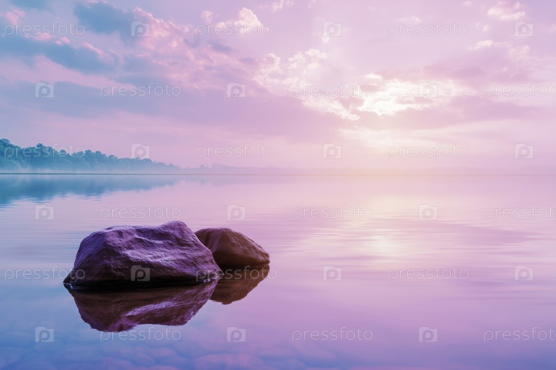 Красивый закат на озере с большими камнями и фиолетовым небом