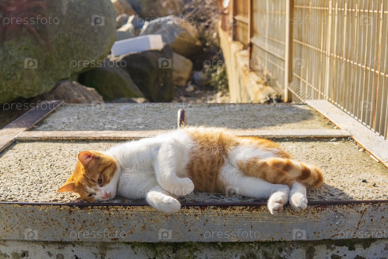 Имбирный кот греется на солнце на бетонном блоке снаружи