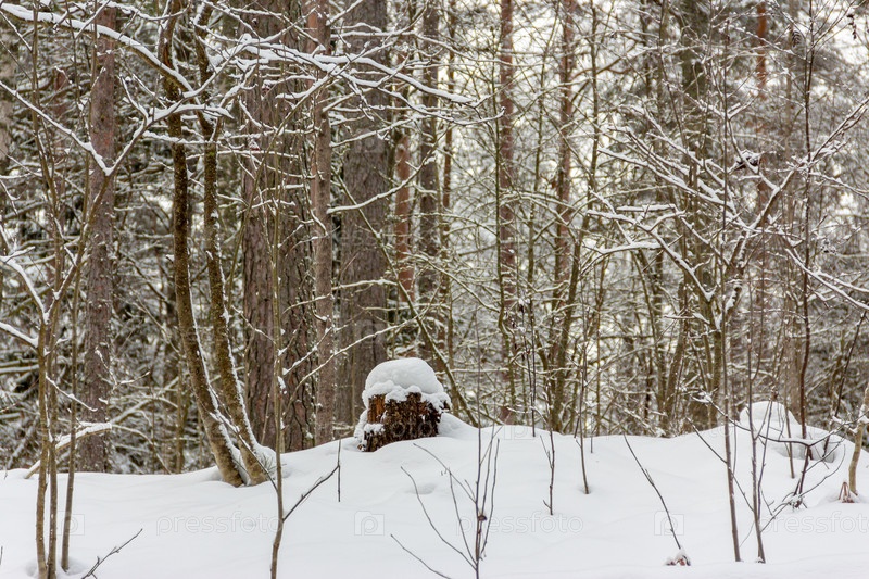 Зимний заснеженный смешанный лес на вершине холма и пень под снегом