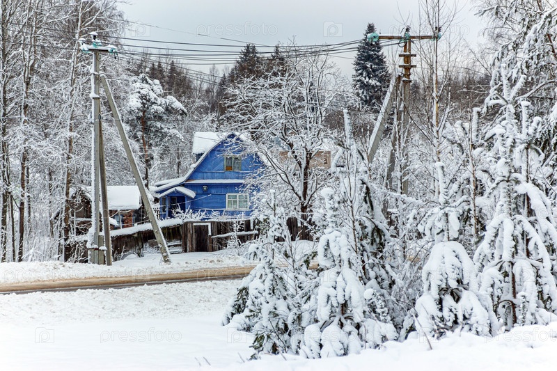 Сельский зимний пейзаж с голубым деревянным домом у дороги и линиями электропередач